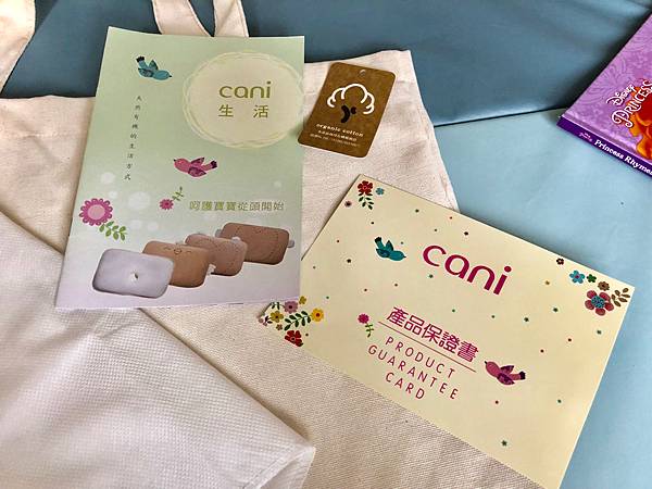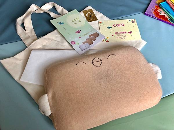 收到枕頭時,有個環保購物袋裝著,裏頭有產品保證書,產品介紹卡、防塵套以及cani air wave 護頭型枕頭,